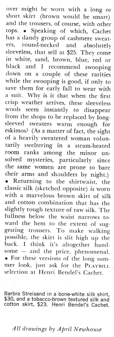 In this general mood, Henri Bendel's new little third-floor boutique, called Cachet, has quite a selection of goodies and seems especially partial to the elongated shirtwaist dress made of beautiful sturdy silk (that some women may even be able to wash successfully) striped in black, blue, red or yellow and white (sketched opposite); or gingham-checked in an even wider, wilder choice of colors. I think I prefer it belted, but you may not. Let your figure decide. And the price, as you see, is not the least of the dream.