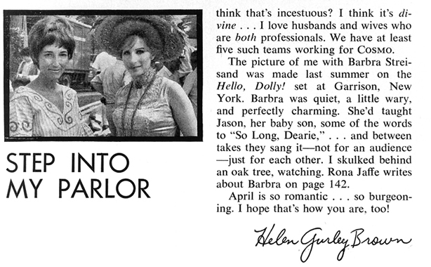 "Wasn't that nice of them to send it!" she said. "They want an autograph," the housekeeper said. "Everybody wants something," Barbra said, and shrugged. I left then, with heartburn, and a very warm feeling for Barbra. "Goodbye." she said at the door. "Take care." But the way she said it, it didn't sound like a cliche; she really meant it. Our visit—and it really was a visit, not an interview—was all relaxed and simple. Barbra Streisand really is a nice lady. If she weren't so talented and such a star and didn't say such kooky things, nobody would bother to write about her. But they would be awfully glad they had met her and spent time with her. I was.