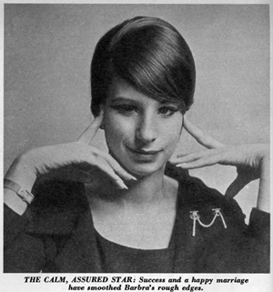 "Does he take good care of you?" I asked, caught up in the spell—realizing that after all this was a young twenty-two-year-old wife, very much in love with a tall good-looking husband, living in her first taste of real security both professionally and privately, the first home of her own, the first emotional life of her own. It was beside the point that for the past ten minutes the den had been filling up with the brusque sounds of businessmen. I saw producer Dick Lewine shuck his coat in the hall and go inside. Someone ticked off a sound on the piano. Thousands of dollars worth of show business brains were waiting for Barbra to finish her talk with me and come switch them all on.