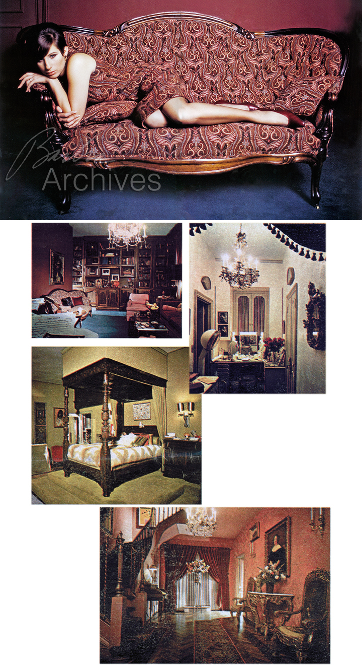 (Photos, above): Gingerbread house. Barbra and Elliott Gould live like Gretel and Hansel in a Manhattan penthouse, once the home of Lorenz Hart. Barbra ordered dress to match paisley love seat in their richly appointed den. Dressing room displays one of their five antique chandeliers.