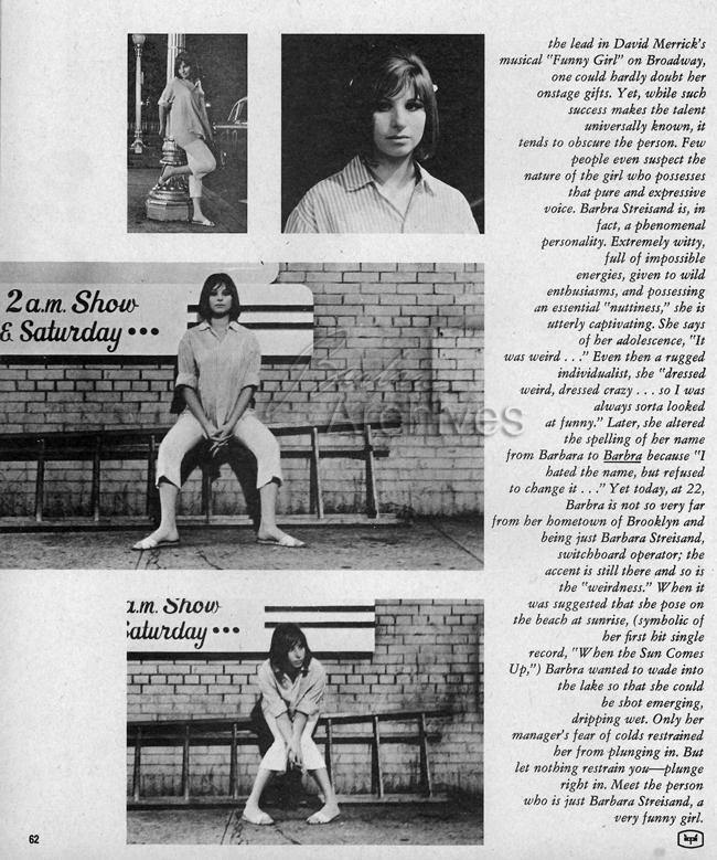 [Note: The photographs in this magazine were taken while Barbra was in Chicago performing at Mr. Kelly's. ... Barbra and Don Bronstein—credited here at Don Sheldon—captured these shots at Michigan Avenue Beach near the famous Drake Hotel. The pictures, below, are alternates from Barbra's 1964 “People” album cover photograph .... Bronstein won a Grammy for Best Album Cover— Robert Cato, who shared the award, was art director for Columbia Records. ]