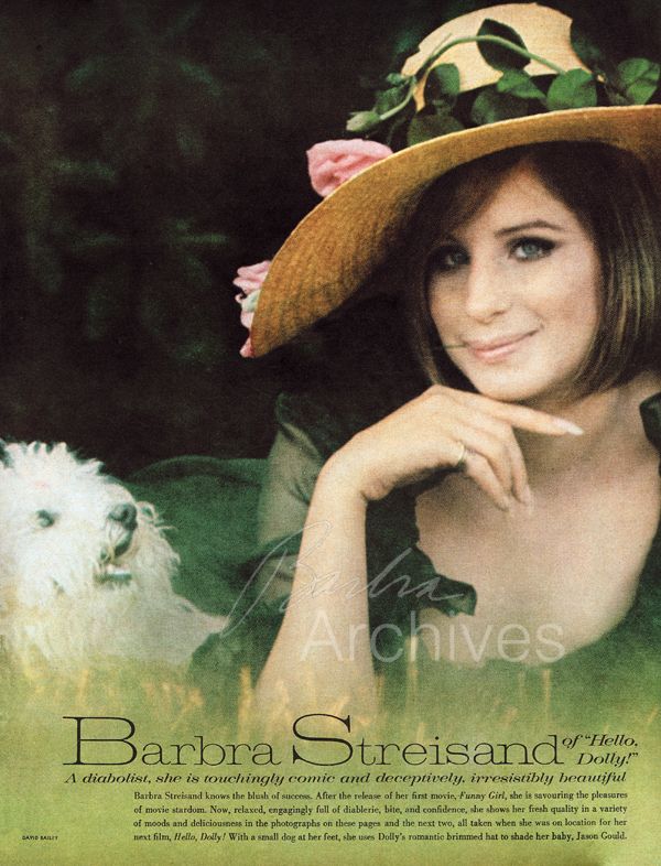 Barbra Streisand knows the blush of success. After the release of her first movie, Funny Girl, she is savoring the pleasures of movie stardom. Now, relaxed, engagingly full of diablerie, bite, and confidence, she shows her fresh quality in a variety of moods and deliciousness in the photographs on these pages and the next two, all taken when she was on location for her next film, Hello, Dolly! With a small dog at her feet, she uses Dolly's romantic brimmed hat to shade her baby, Jason Gould.