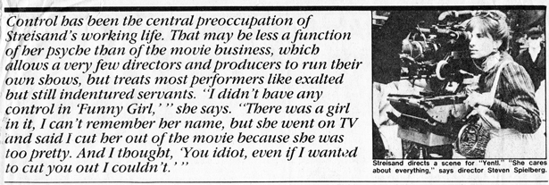 Steven Spielberg, a friend of Barbra's who is no stranger himself to spectacular feature film debuts, is so enthusiastic about her work in “Yentl” that he’s been saying she could have one of the most exciting directorial careers since Francis Coppola. Spielberg was struck by the generosity of her direction. “I think she tried to put everyone ahead of her in her list of priorities. lt’s selfless directing. There was no ego involved at all.” He also expressed amazement at her eye for detail. “l think it comes from the fact that she just cares about everything, from the smallest bit of behavior to the dubbing to the mixing of her sound tracks and the correction of her color.
