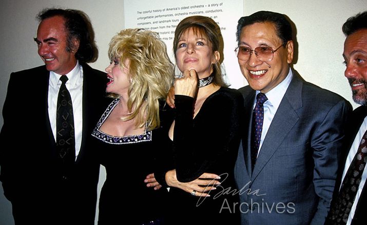 Above: Norio Ohga, second from right, poses with Barbra Streisand and Dolly Parton and Neil Diamond, left, as singer Billy Joel, right, looks on following the concert.